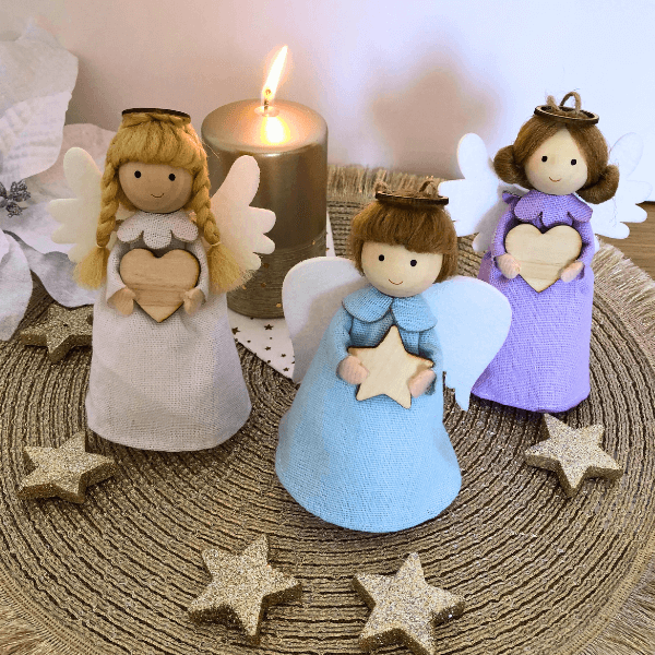 Our Angels, available in boy (blue and white) and girl (white, purple, and pink) designs, are perfect for personalization. You can write a name on the wooden heart or star they hold, making it a unique keepsake. Whether displayed on a desk or hanging from your Christmas tree, these angels bring love, protection, and hope. Crafted from jute, wood, burlap, and felt, and beautifully packaged in an organza bag, they make a heartfelt gift for spreading joy and comfort to loved ones.