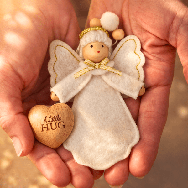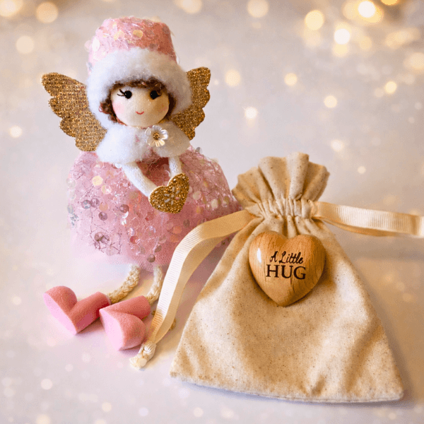 Hanging angel + wooden “A Little Hug” heart, packed in a gentle cotton bag.