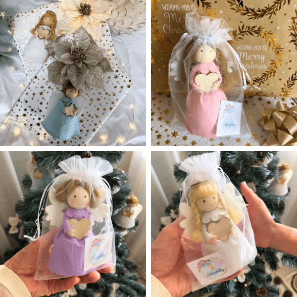 Experience the magic of the holidays with our Handmade Angel! These Guardian Angels hold a wooden star or heart, ready for your personal touch. While we don’t offer personalization services, you can easily write a name or message, turning them into unique keepsakes for your loved ones.